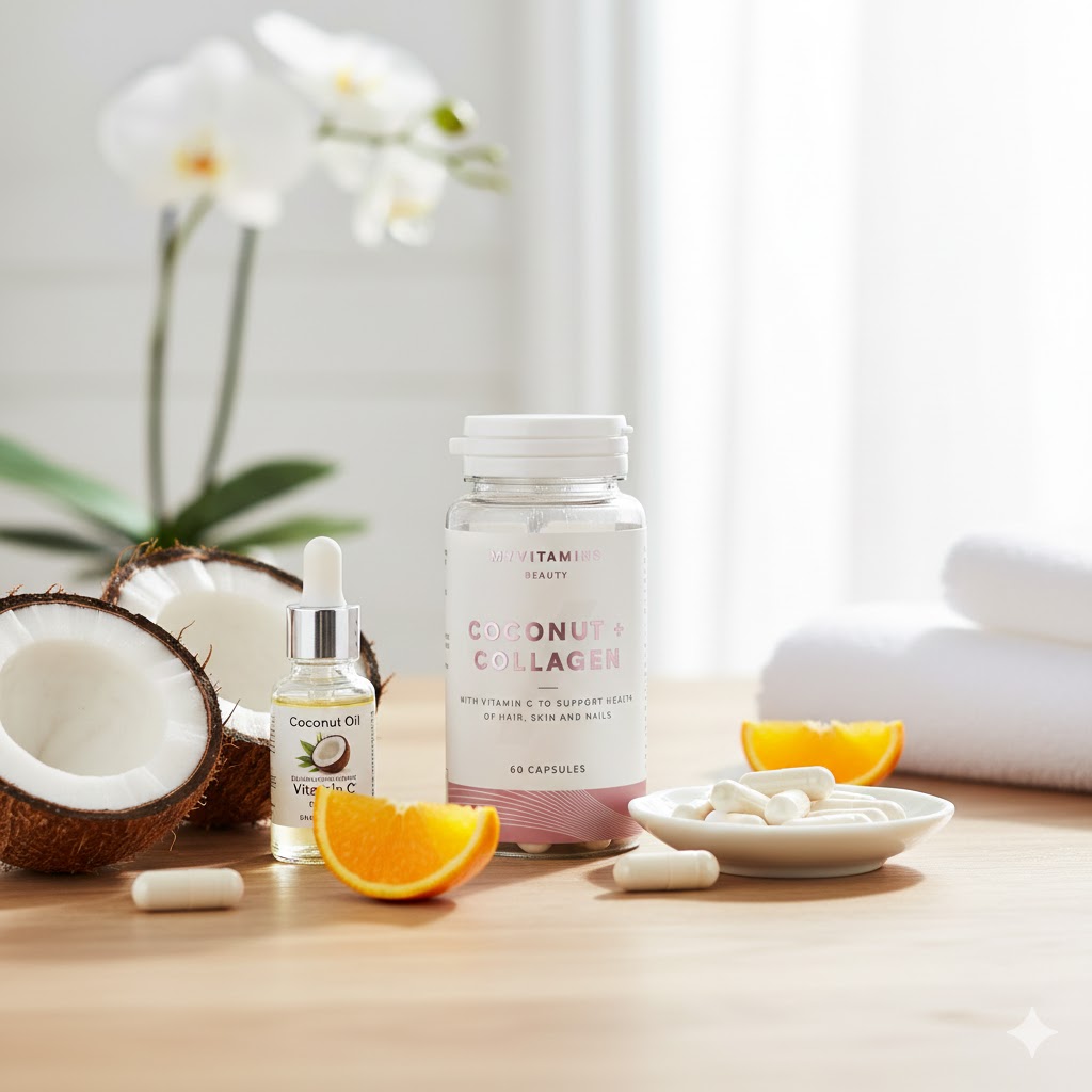 • کلاژن پلاس کوکونات مکمل تغذیه‌ای حاوی کلاژن، روغن نارگیل و ویتامین C